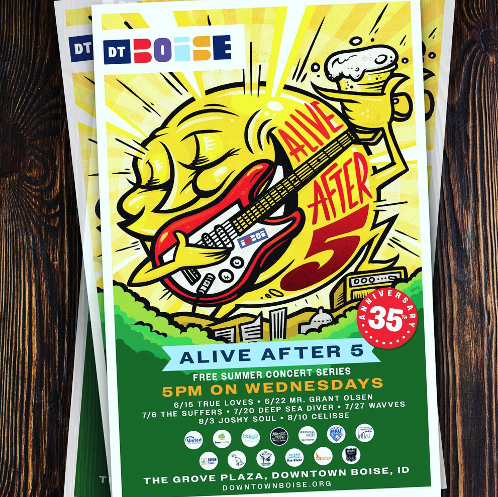 Alive After 5 35th anniversary poster design. New @downtownboise branding by @116andwest #downtownboiseassociation #boisedowntown #boisegrove #boiseconcerts #summerinboise #aliveafter5 #illustration